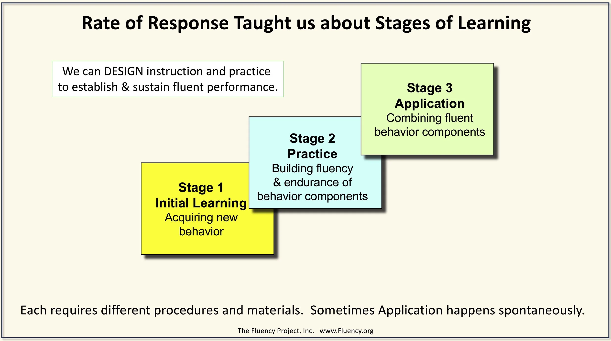 Applying Skinner’s measure, rate of response — which he considered to be his most important contributon — we discovered the stages of learning. One cannot even SEE the stages of learning if one does not include the time dimension when measuring behavior. And one cannot distinguish what we later came to call fluent performance – the ability to perform quickly, smoothly, and confidently. – without measuring it in time. Percent correct leaves educators, trainers, and others blind to important changes in the development of skilled behavior, moving from hesitant acquisition of new behavior, to practice for fluency, and application or combination of fluent components. We discovered in countless experiments and instructional sequences that to be masterful at any skill, one needs fluent behavior components. That was a major discovery of Eric Haughton and his students, especially Clay Starlin.
